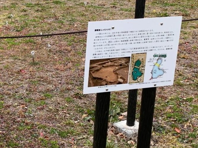 発掘調査をした結果、実は大奥を描いた絵図にもこういう池っぽいものが描かれていて、おそらく同じものだろうということはわかっているのですが、漆喰を塗ると水が溜まりやすいので、しかも規模的にそんなに大きな池じゃないんですよね。今、ちょっと看板を立てていますが、小さい池なんですけれども橋がかかっていて、上から見るとひょうたんみたいな形をしています。