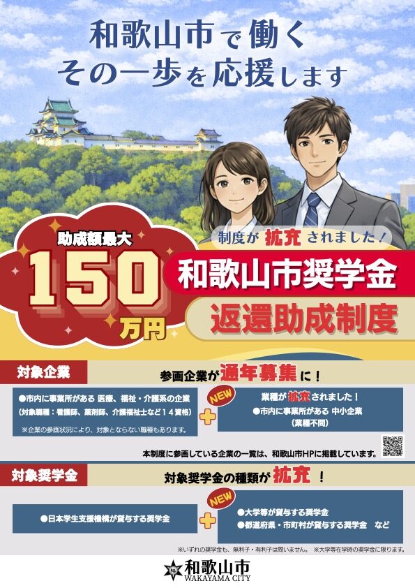 奨学金を借り受けている又は借り受ける予定の学生が、卒業後に和歌山市内に住んで、医療、福祉・介護系の法人又は中小企業の参画企業に就職し3年間定着した場合、企業と和歌山市が連携して奨学金の返還を助成するものです。