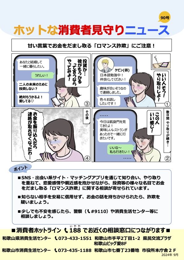 和歌山県警の相談ダイヤル「ちょっと確認電話」(0120-508-878)で24時間相談できます。怪しいな、おかしいなと思ったらいつでも相談してください。