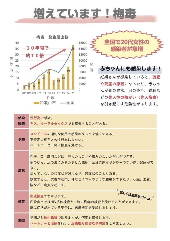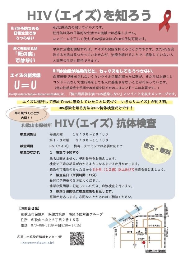 HIV検査のお問合せは、和歌山市保健所保健対策課073-485-5118までお電話ください。