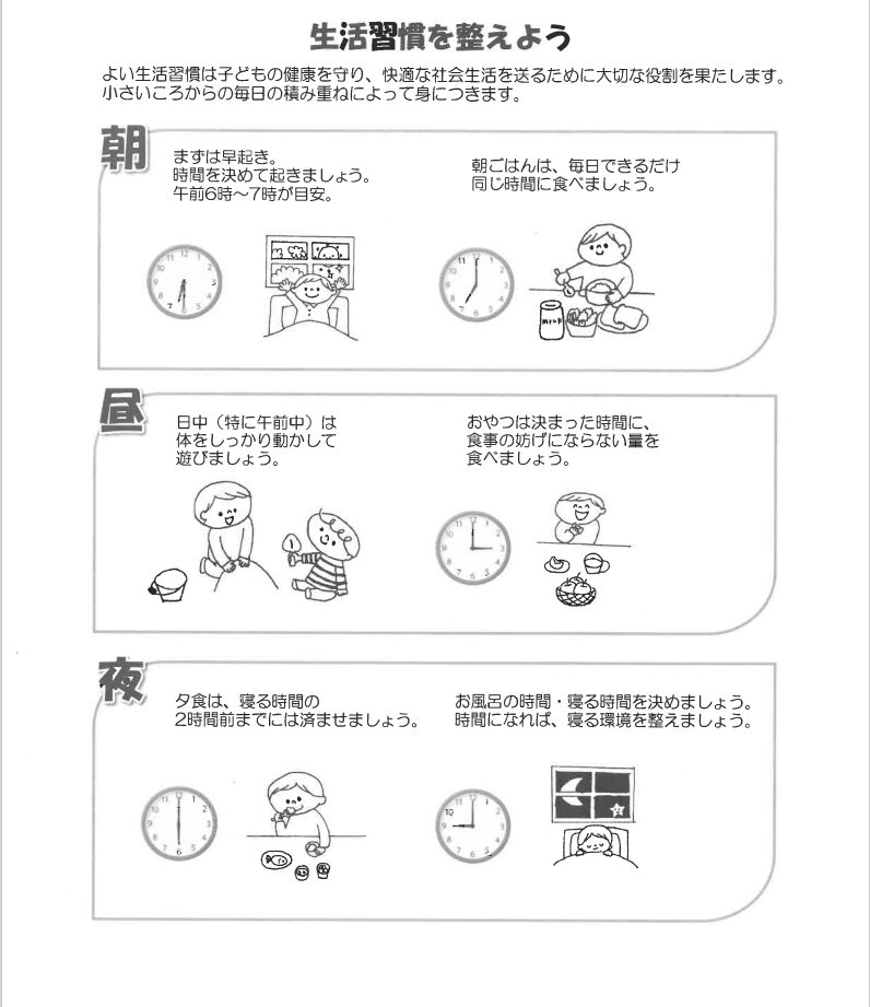 また、子どもの頃に身に付けた生活リズムは成長してからも崩れにくく、生涯にわたる生活習慣の基盤となり、その子の一生の健康に大きな影響を及ぼすといわれています。