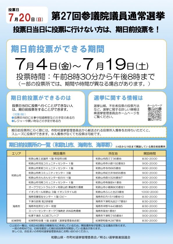期日前投票所は、7月4日(金曜日)から7月19日(土曜日)までの間、和歌山市内8箇所に設置しています。
