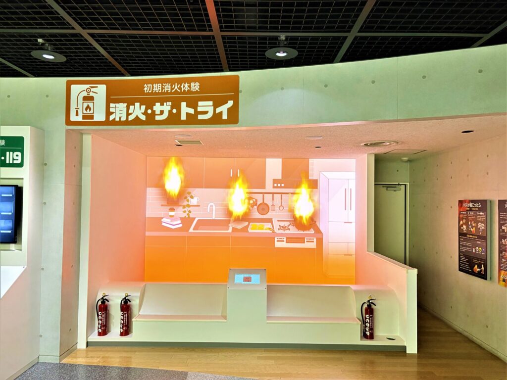 大迫力画面とセンサー式の模擬消火器を使って、消火器の正しい使い方を身に付けてもらう「初期消火体験」