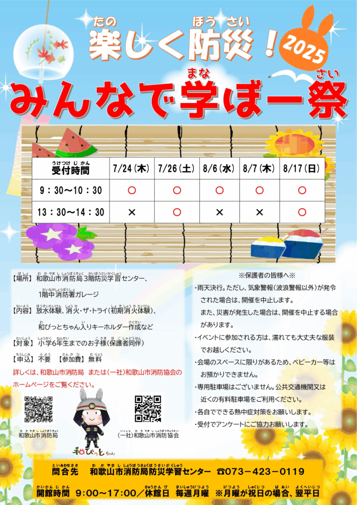 お問い合わせは、和歌山市消防局防災学習センター、電話番号073-423-1119でお願いします。