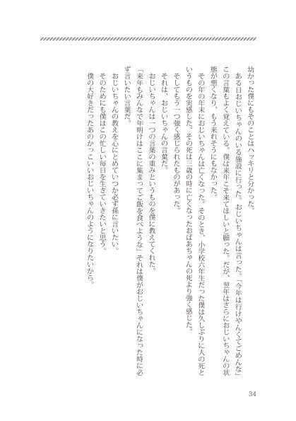 その年の年末におじいちゃんは亡くなった。そのとき、小学六年生だった僕は久しぶりに人の死というものを実感した。その死は三歳の時に亡くなったおばあちゃんの死より強く感じた。