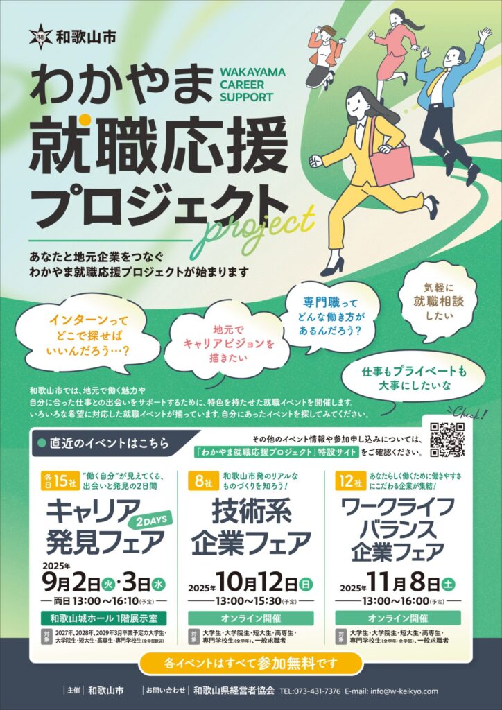 わかやま就職応援プロジェクトとは、和歌山市内で働きたいと考える方々を応援するため、学生から一般求職者、社会人まで幅広い層を対象に就職を支援する事業で、今年度はテーマを設けた特色ある5つ就職イベント開催します。
