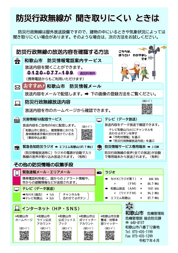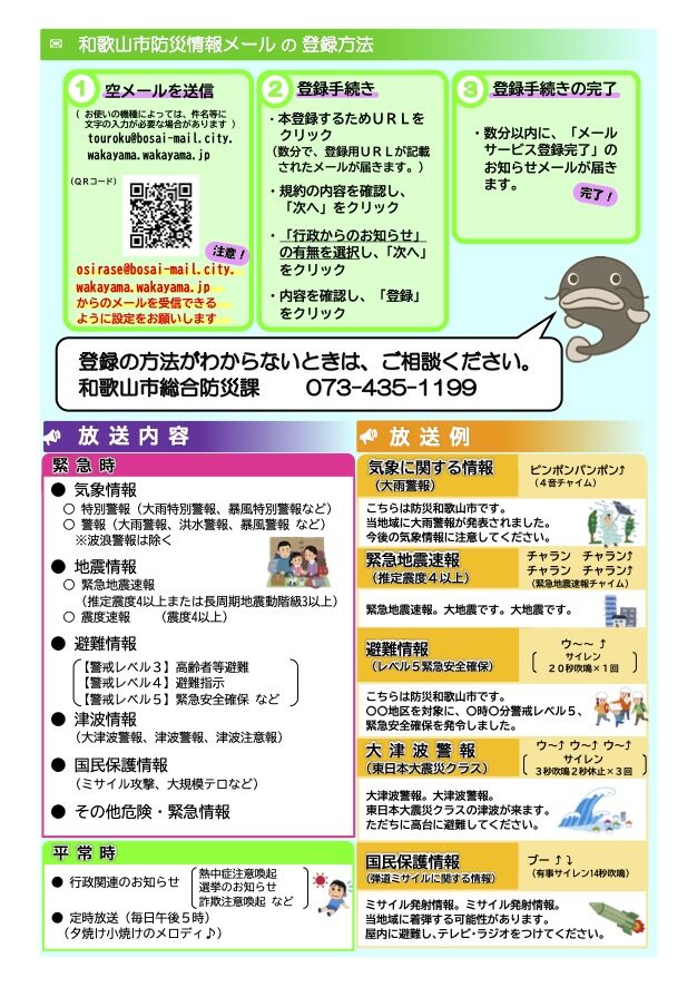 情報を受け取ることができますので、詳しくは総合防災課、電話番号は「073-435-1199」までご連絡