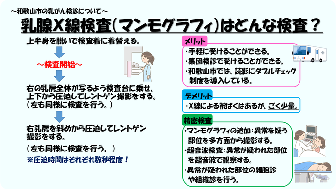 和歌山市の乳がん検診は、現在、市内12箇所の医療機関での個別検診と、検診バスによる集団検診を実施しています。