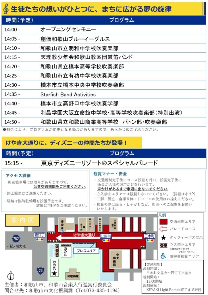 「けやきスペシャルパレード」は、和歌山城のそばを通る「けやき大通り」を会場に、11月23日・日曜日の祝日に開催するマーチングパレードです。