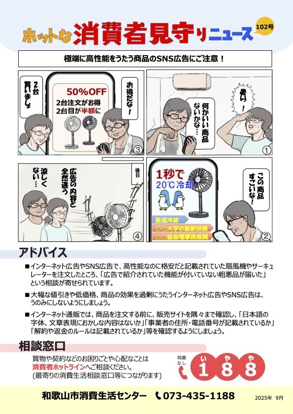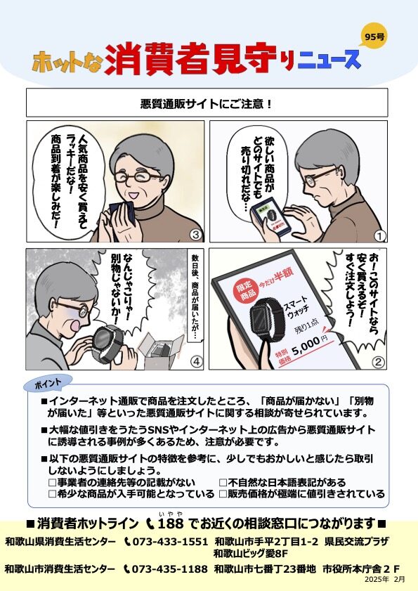 活センター(073-435-1188)へ相談してください。既に代金を支払ってしまった場合は、できるだけ早く銀行やクレジットカード会社、警察などにも連絡・相談してください。
