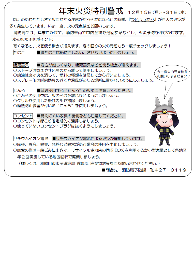 和歌山市消防局では毎年12月15日から12月31日までの間、年末火災特別警戒を実施しています。
