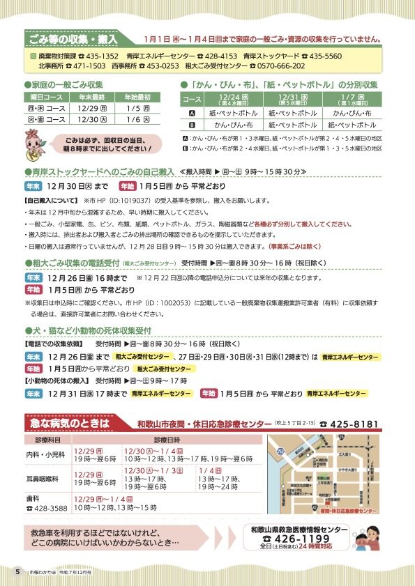 ごみの収集や自己搬入などの年末年始の日程などについては、「市報わかやま12月号」や和歌山市のホームページなどでご確認いただけます。