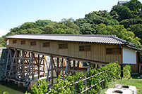 この橋は殿様が渡る専用の橋、ということですので、外から移動してる姿とか見られないように壁がついていて、雨が降っても移動できるようにと屋根がつけらて、本当の意味での廊下橋という形になっています。