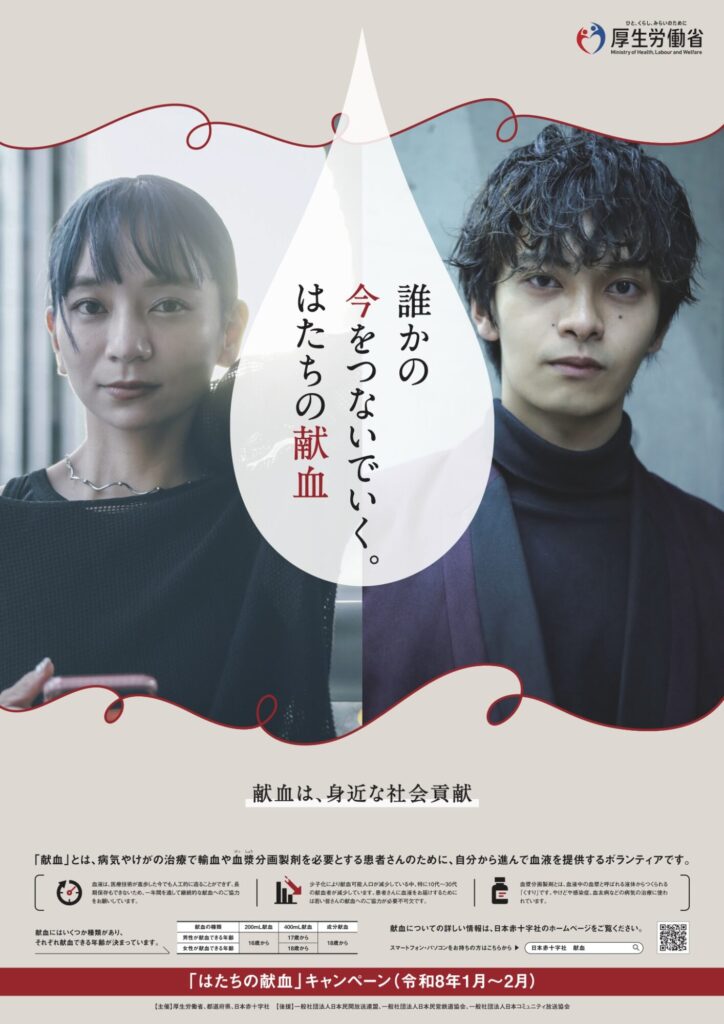 私たちは人と人との「つながり」の中で、毎日を生きています。あなたが「今」、献血という勇気ある行動を起こすことによって、血液を必要とする人の「今」がつながっていく。あなたのやさしさが、社会の中で確かに広がっていく。今も、そしてこれからも。「はたち」の皆さんが、社会の未来をつないでくれることを願う、そんな思いが込められています。