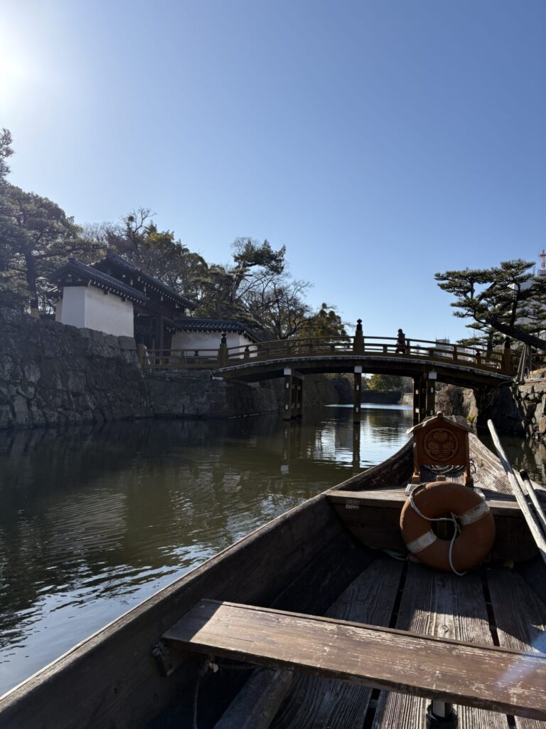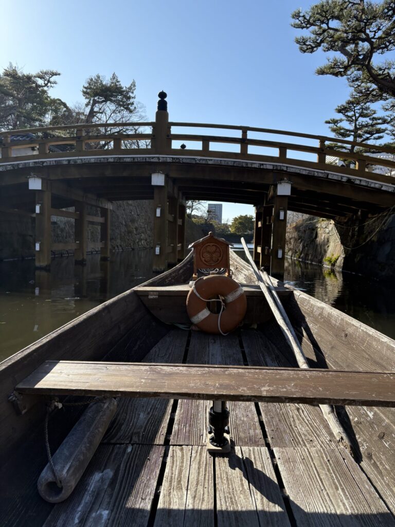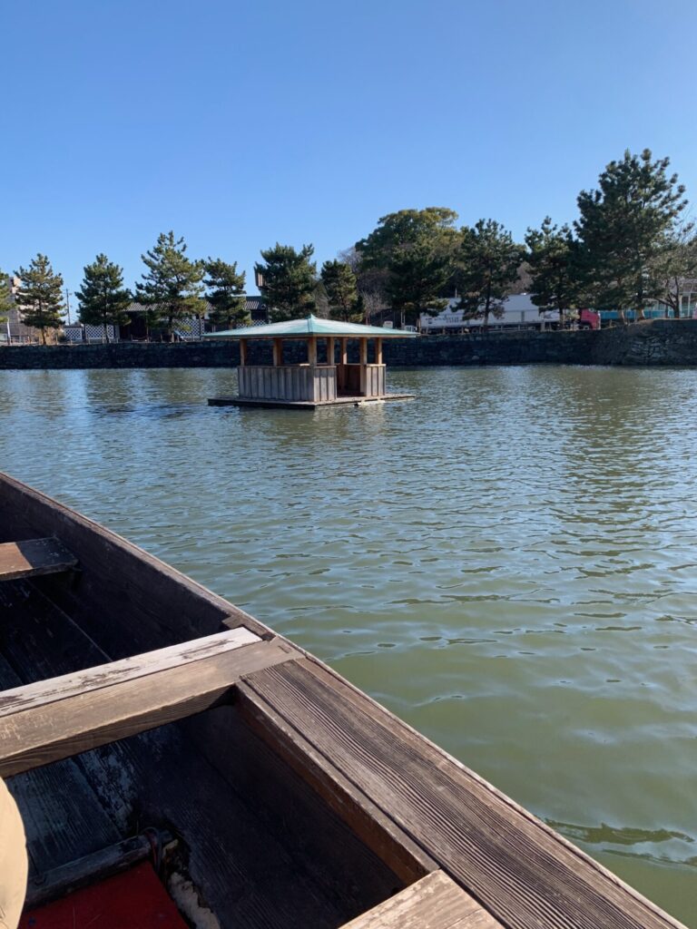 よく言ってくれました、これは熊野古道で今でも現役で浮かんでいる舟を持って来させていただきまして、ずっと三船祭りとかで使ってる舟を、川舟でないとお堀の底を擦ったりしますので手作りの木舟、川舟をもって運行させていただいております。