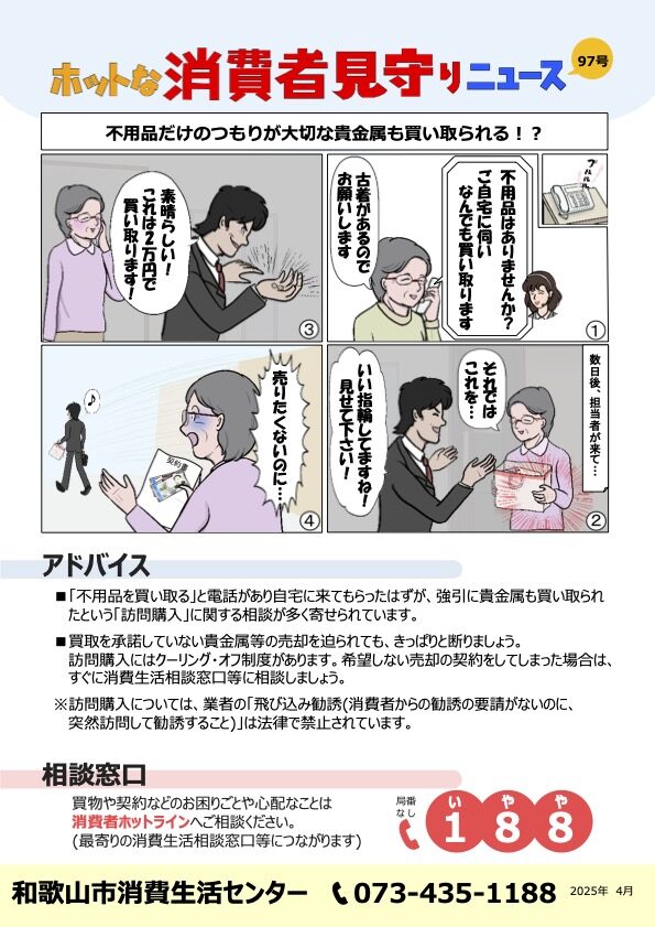 活センター(073-435-1188)へ相談してください。既に代金を支払ってしまった場合は、できるだけ早く銀行やクレジットカード会社、警察などにも連絡・相談してください。