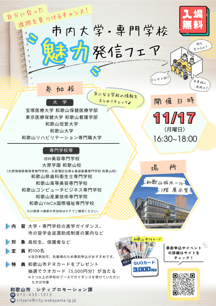 11月17日月曜日の16時30分から18時まで、和歌山城ホールにおきまして、高校生や保護者の方を対象にした、進学ガイダンスを開催いたします。参加していただいた方には和歌山市PRカードや抽選でクオカード三千円分が当たるキャンペーンも実施します。