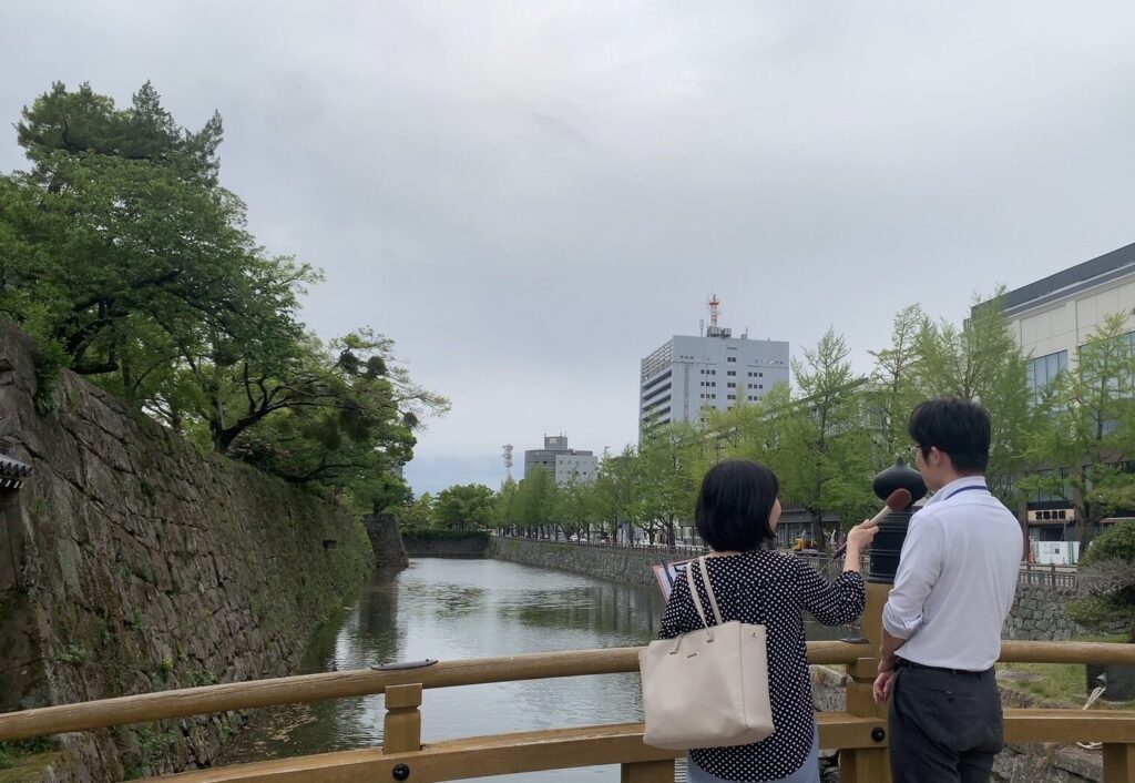そうですね、この一の橋から市役所の方向、西側の方を見ますと内堀がずっと奥の方まで続いているのが見えますし、それに沿って高い石垣も二の丸の西側に向かって続いているのがよく見えますので、お城の大きさというものが実感しやすいのでは、と思います。